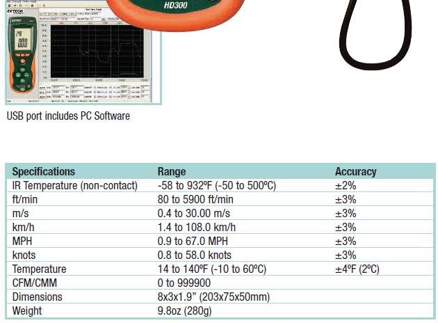 美國Extech HD300葉輪風速儀風速測量范圍:0.4~30m/s,可測量并顯示風速,氣流量,氣溫和表面溫度(采用內(nèi)置非接觸式紅外線溫度計)?蓽y量高達500℃的遠程表面溫度。