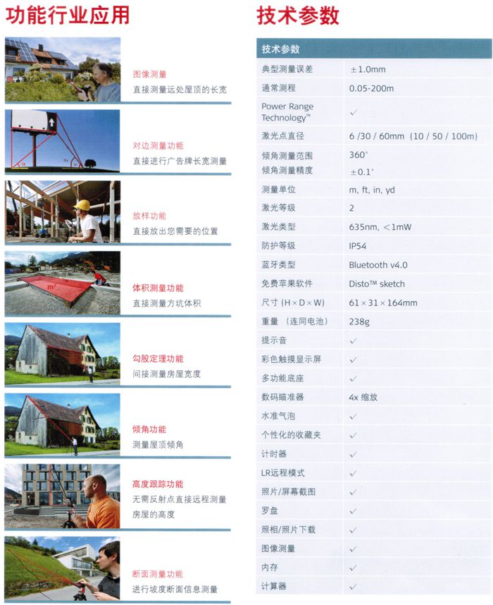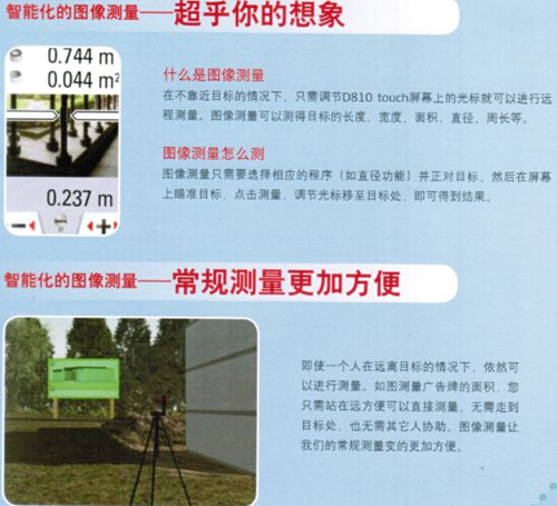 徠卡迪士通D810 touch觸摸屏手持式激光測距儀是世界上唯一一款帶圖像測量的手持激光測距儀。它在不靠近目標(biāo)的情況下,調(diào)節(jié)D810 touch屏幕上的圖像光標(biāo)就可以進(jìn)行遠(yuǎn)程測量。圖像測量可以直接測量目標(biāo)的,長度、寬度、面積、直徑、周長等。 徠卡D810 touch具有高精度羅盤、舒適的彩色觸摸屏、四倍數(shù)碼瞄準(zhǔn)器、清晰的數(shù)碼照相功能、鋰電池充電、新一代藍(lán)牙4.0、徠卡Sketch軟件等諸多優(yōu)勢。這些功能讓測距儀不再是個工具而是儀器。