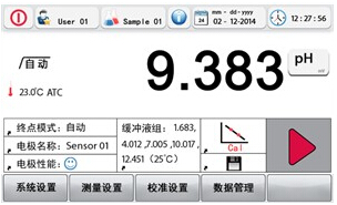 所有pH測量和校準(zhǔn)相關(guān)的重要信息都清晰地顯示在4.3寸的彩色大液晶屏上。一次簡單觸摸即可進(jìn)行測量、校準(zhǔn),或者在不同測量模式切換,隨機(jī)可見,如:電極狀態(tài)、當(dāng)前緩沖液組等?珊唵我淮斡|摸,即進(jìn)入對應(yīng)的樣品名,用戶名,時間日期等的設(shè)置。