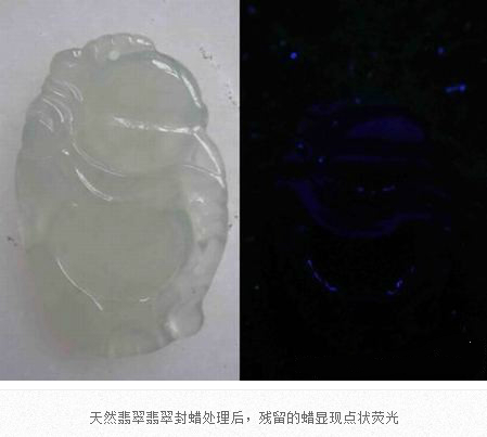 翡翠成品在雕刻成為毛坯后,在拋光前,都會(huì)進(jìn)行封蠟處理,封蠟后可使蠟在拋光后進(jìn)入翡翠表面存在的微細(xì)凹坑或裂隙中,填補(bǔ)其不平,使翡翠顯得更加圓潤(rùn),增加其光亮程度亮,還可防止油漬的進(jìn)入。當(dāng)然,封蠟的最主要的目的就是為了掩蓋裂紋。由于有蠟存在于翡翠中,在紫外熒光燈下會(huì)產(chǎn)生明顯紫外熒光。